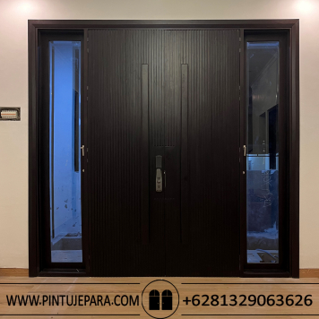 Pintu depan ini memiliki daun ganda atau pintu double dengan dua jendela, cocok untuk pintu rumah utama yang ingin tampil stylish namun tetap fungsional. Pintu produksi pintujepara ini mengutamakan keindahan sekaligus kekuatan, menjadikannya solusi ideal untuk kebutuhan rumah Anda yang menginginkan estetika minimalis dengan material premium.
